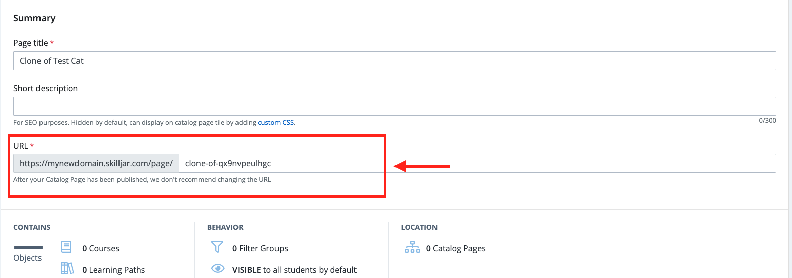 It's highly recommended that you give the new Catalog Page a new URL/web address. A new one will be automatically generated for the new Catalog Page upon creation but will include "clone-of-" and then the original pages' address. For example, Domain.skilljar.com/pages/clone-of-qx9nvpeulhgc.