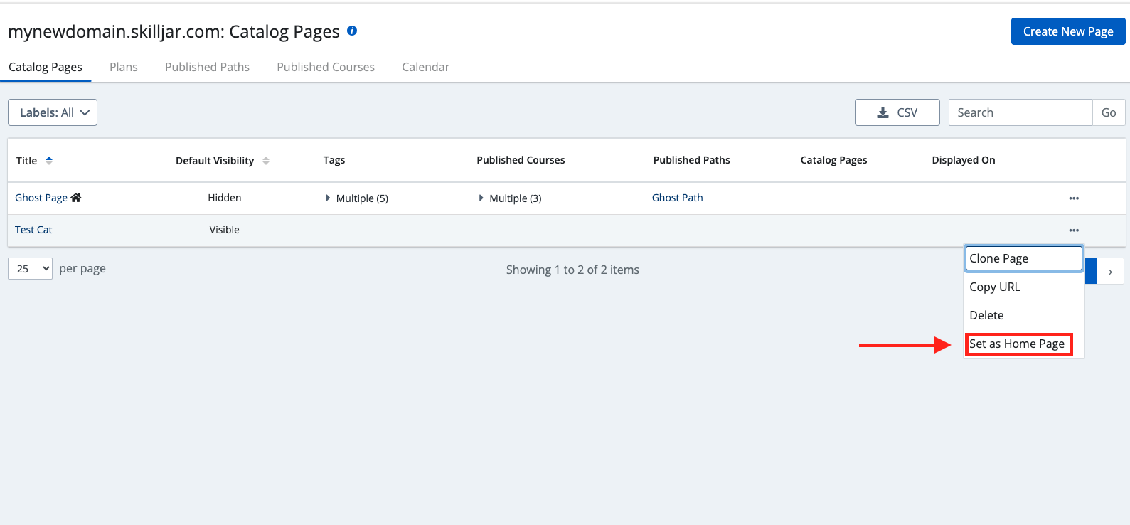 You can set and change Catalog Pages as your home page, making it the first page learners will see when they visit your training domain.