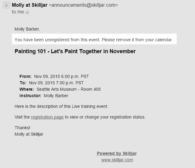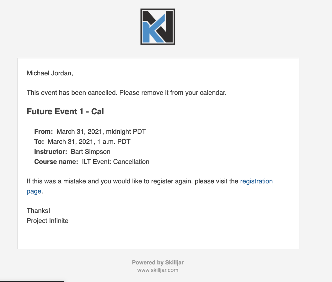 - All students registered for an event that is canceled by a Skilljar Admin will receive an event cancellation email (This is similar to the email Skilljar sends students for deleted events). Please note, this email notification is not customizable.