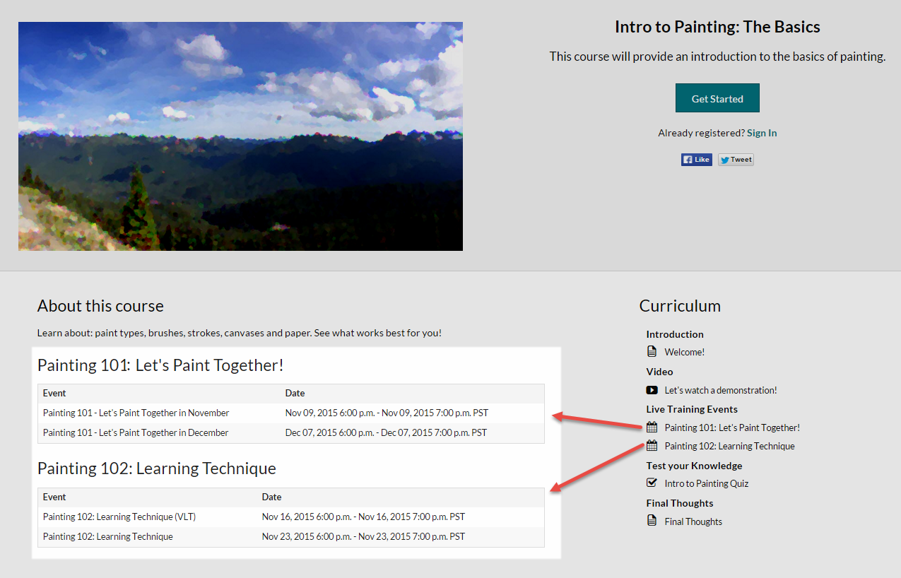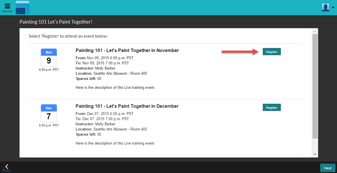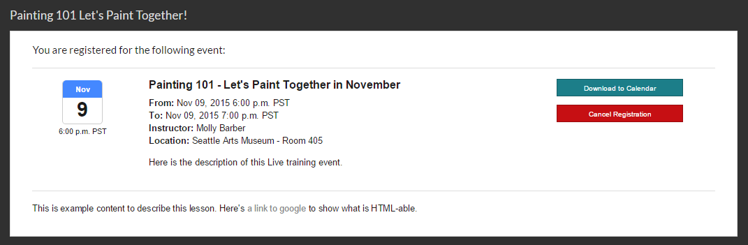 Before registering for your course, a student can see the live events on your course details page. They can then self-register and self-cancel for the live training that works best for them. Users can download these events to their calendars and will receive email confirmations for any registrations and cancellations.