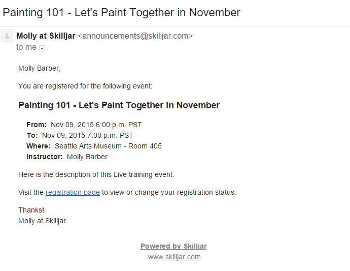 - When a user registers, they can download the calendar item for that event and will receive an email confirmation with event details.